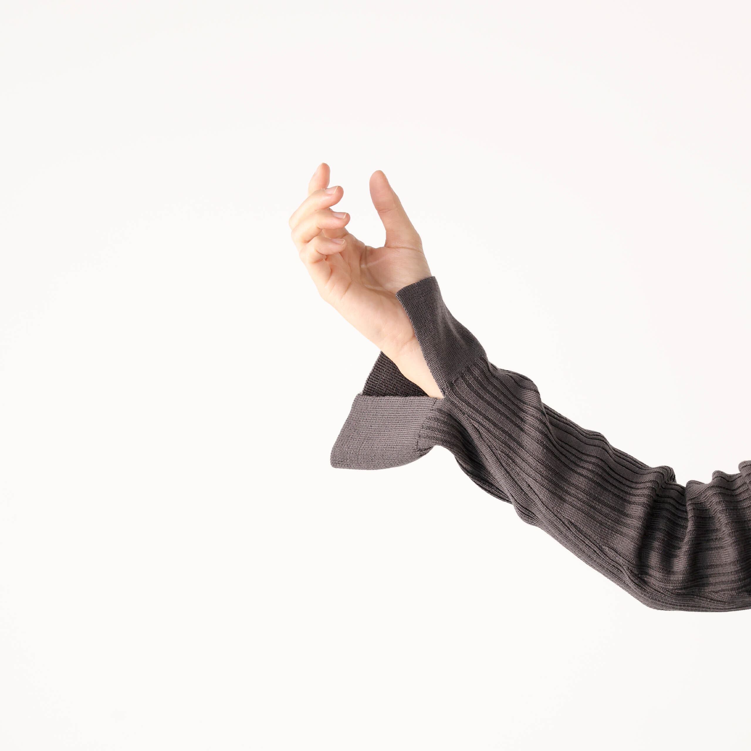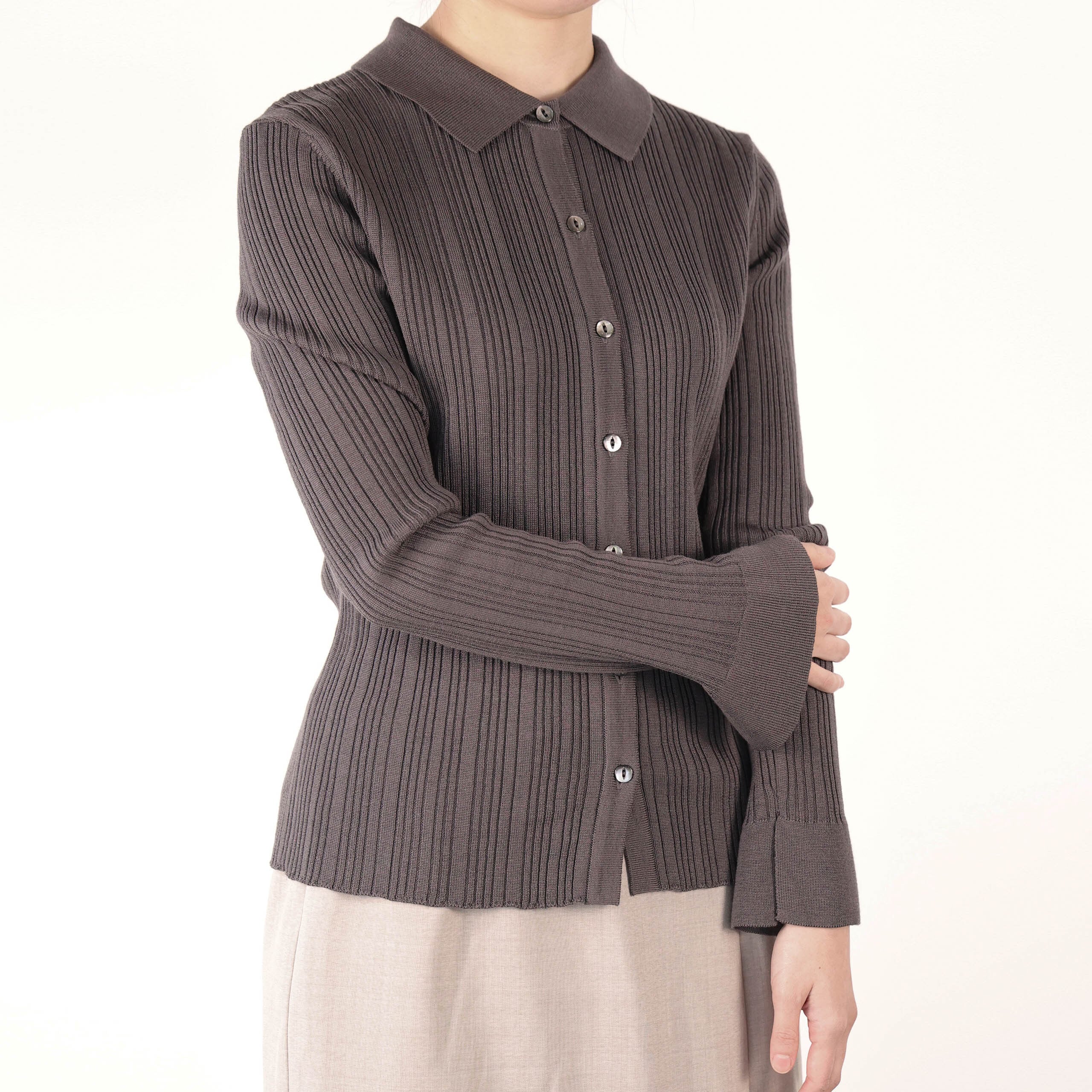 すっきりと開いたラウンドネックと、縦のラインを強調するリブ編みが、装いに上品なリズムを与えます。